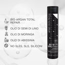 Gentle and moisturizing shampoo, enriched with precious natural active ingredients such as BIO-ARGAN TOTAL REPAIR and linseed oil. It gives strength, elasticity and body to the hair, restructuring it in depth, wash after wash. For frizz-free, soft and fragrant hair.