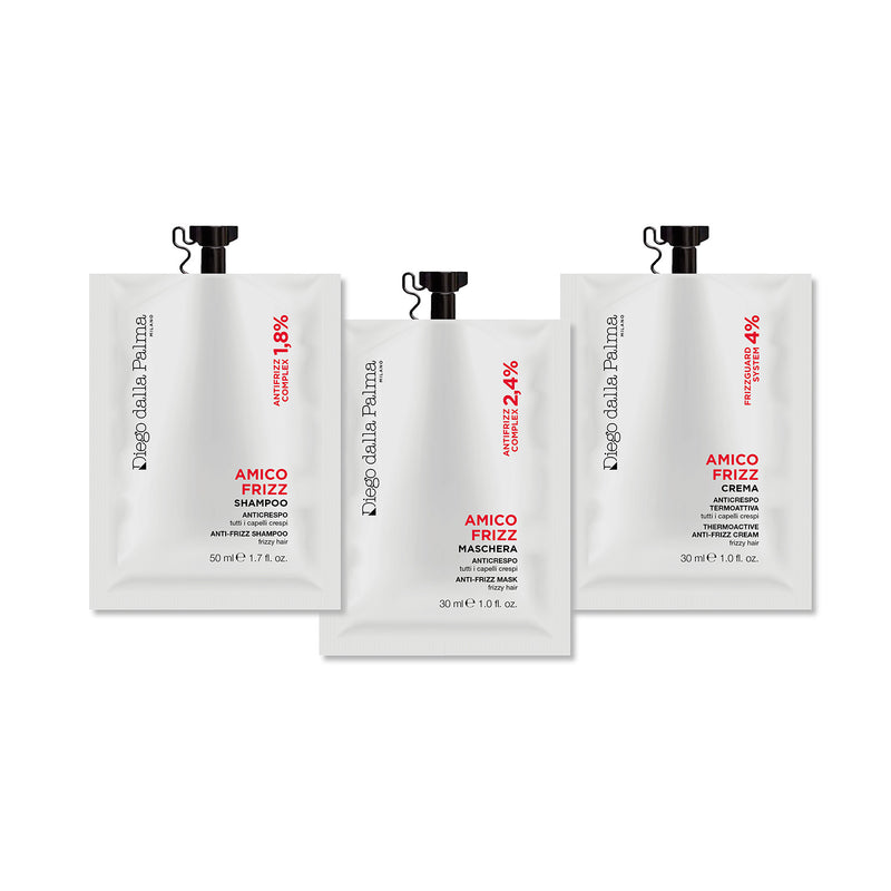 The Amicofrizz Routine is designed to discipline unruly hair, protect it from heat, and maintain softness, elasticity, and long-lasting control. Three products that work in synergy to deliver a smooth, tidy, and visibly healthier mane, without weighing it down.